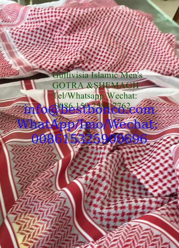 Jacquard headband--- Refers to the weaving method of single-sided embossing jacquard. The headscarf is made of improved looms. The adult size is generally divided into 52", 55", 58", 60" and 62". The ingredients are cotton, polyester-cotton blend, polyester. And blended yarns, etc., have different styles and qualities in winter and summer. Different countries have different preferences for color. The Arabian Gulf countries are mainly red and white, black and beige, and other countries are mainly dark. .